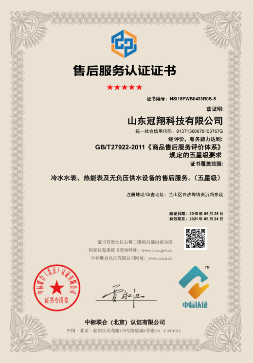 供水設(shè)備五星級(jí)售后服務(wù)認(rèn)證證書