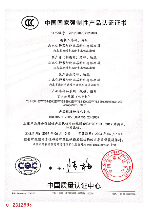 室內(nèi)加熱器(電熱板)CCC認(rèn)證證書